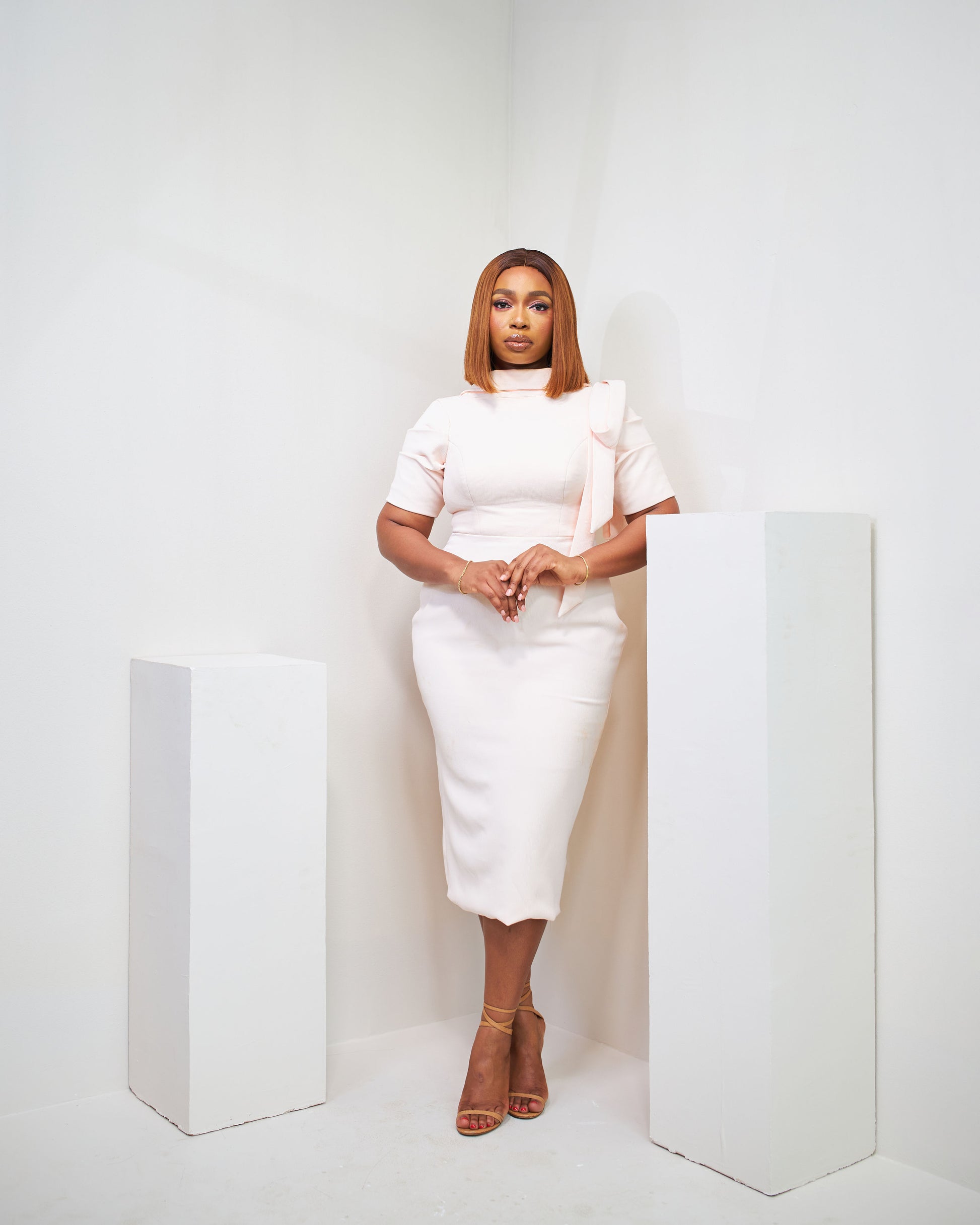 Beige gown with a figure-flattering up-turn high neck and alluring low back.
