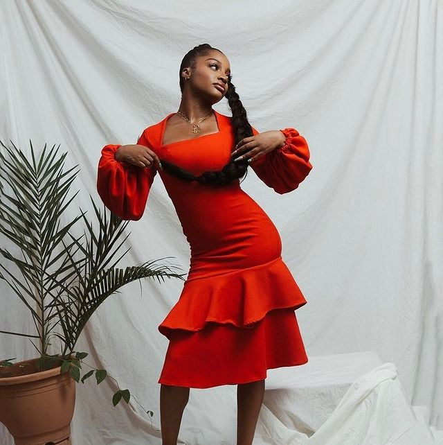 This dress features a double-layered bottom and slightly exaggerated sleeves, making it a unique and stylish addition to your wardrobe.