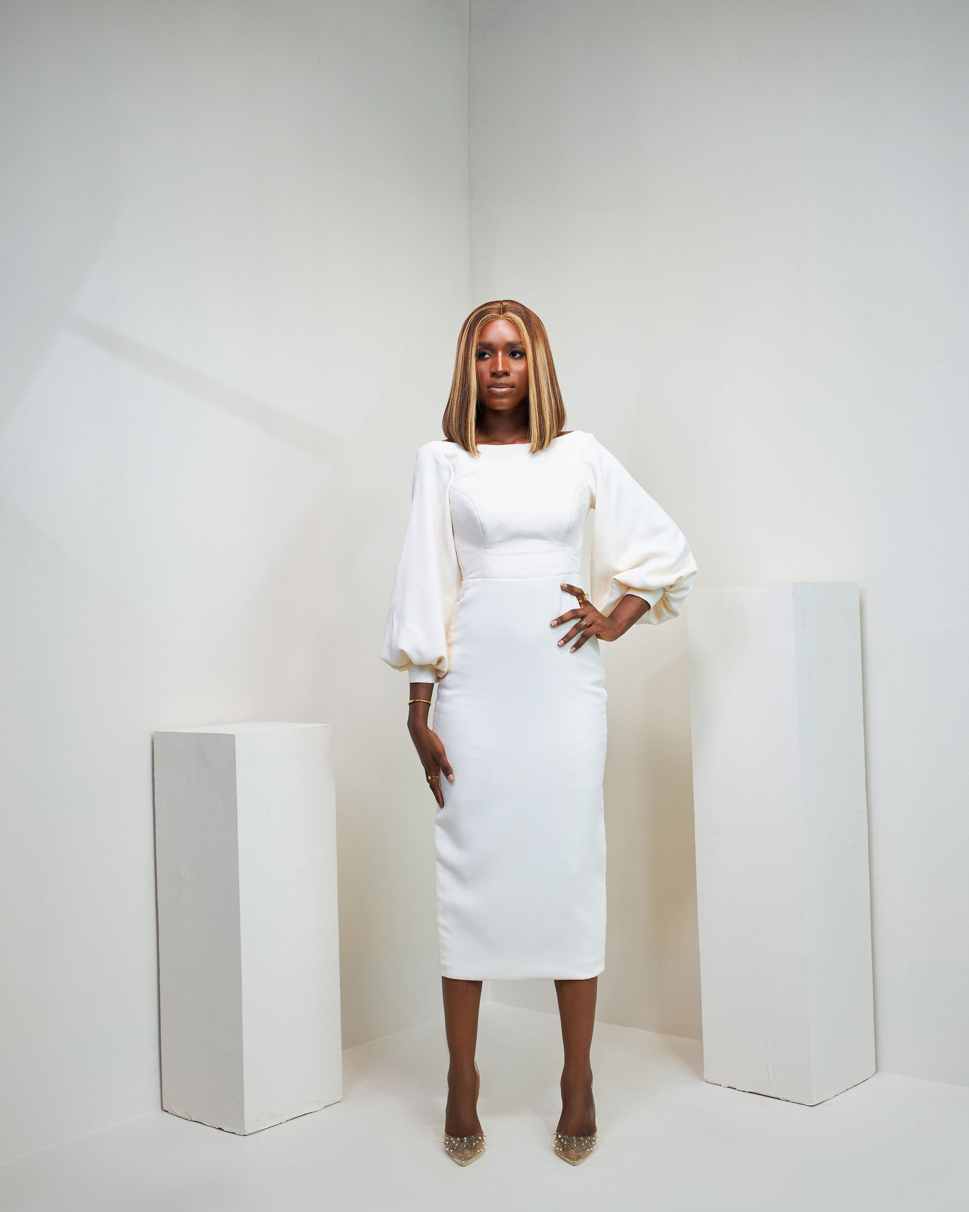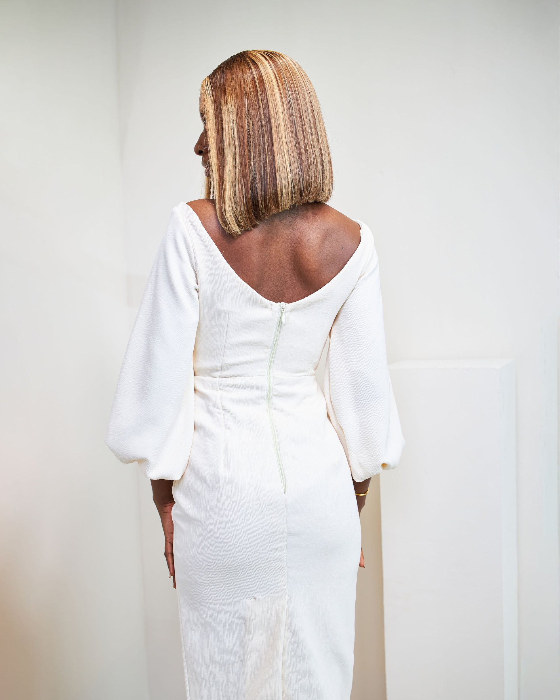 Indulge in the timeless elegance of The CHINWEUBA Piece, featuring a straight off-white dress with three-quarter exaggerated sleeves, a high neck, and a low back. The perfect blend of sophistication and modern flair, creating a jaw-dropping ensemble that will turn heads and leave a lasting impression.