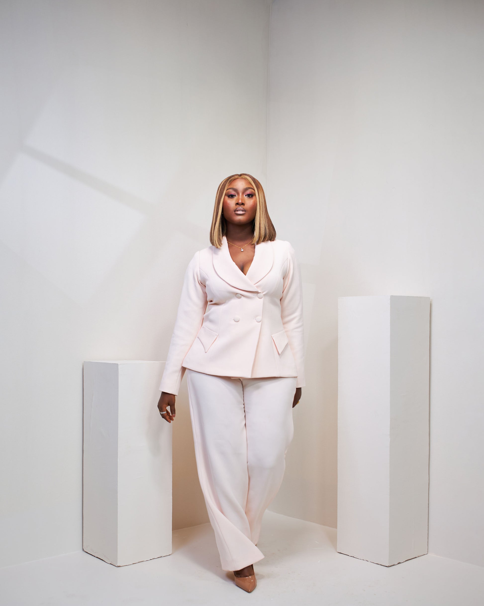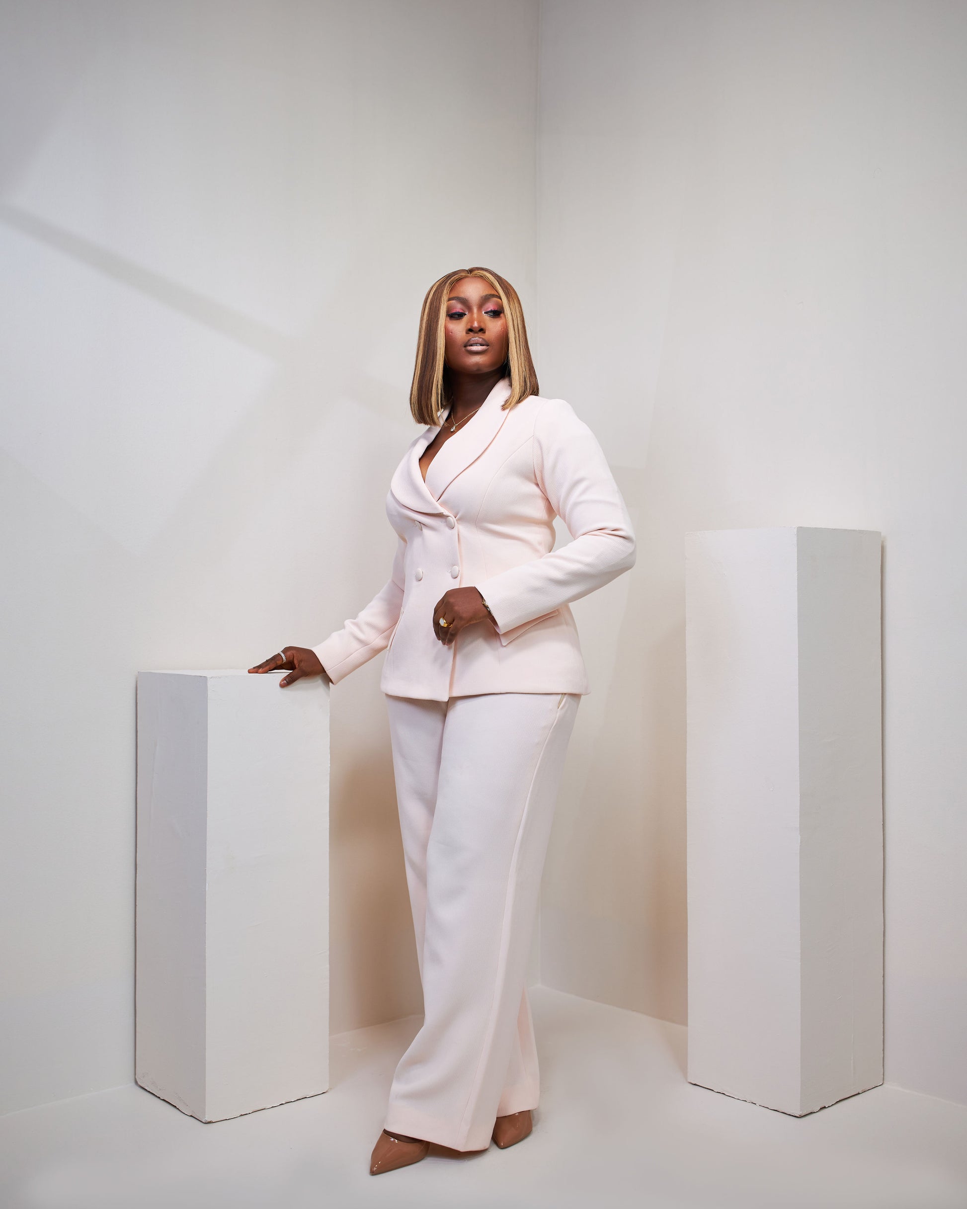 The DIUTO Suit is a double-breasted suit, it features a warm beige color, wide-leg pants, and a rounded lapel for a classic yet stylish look.