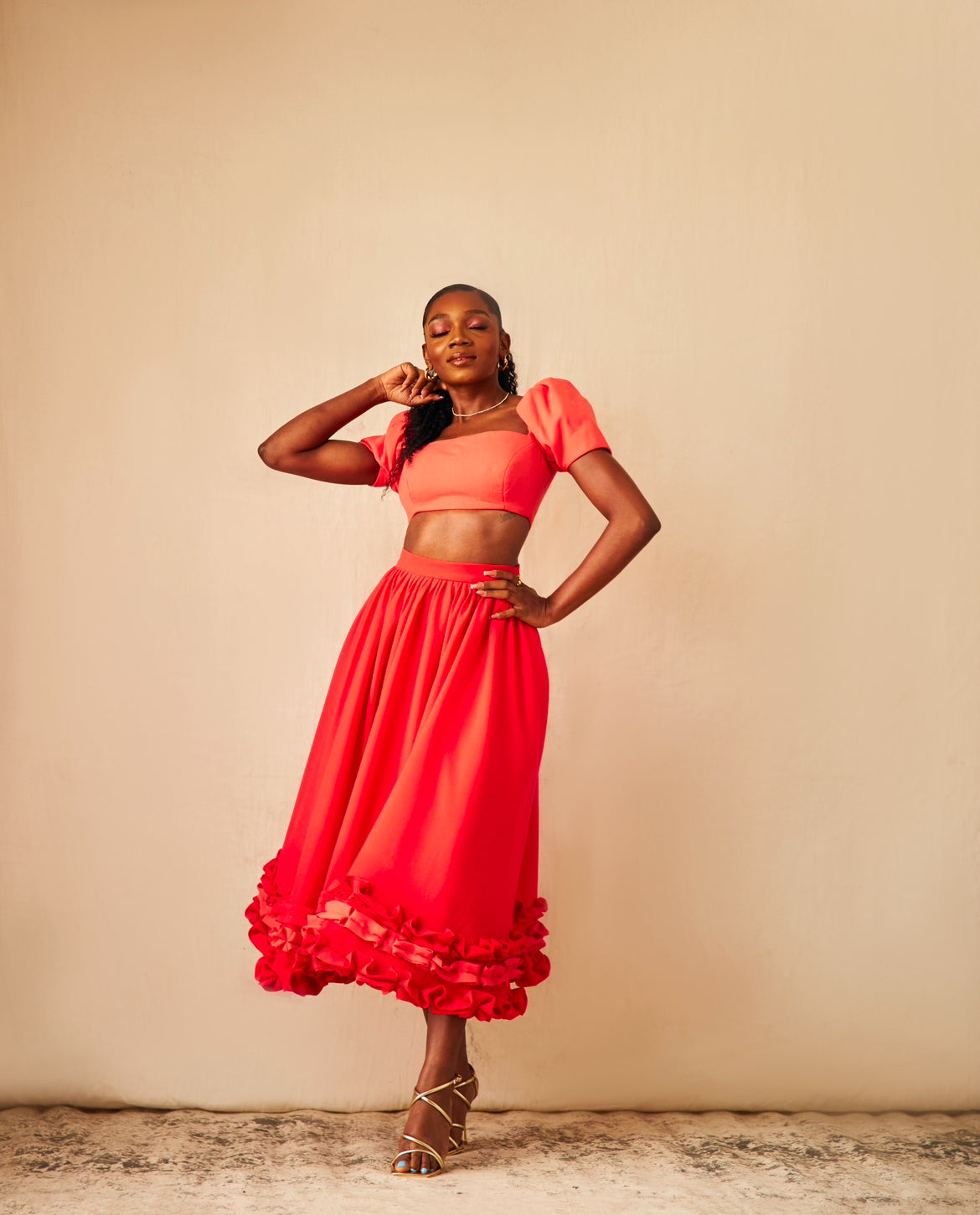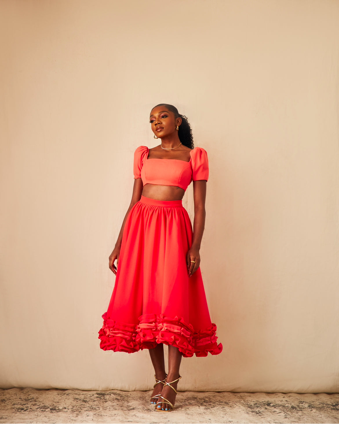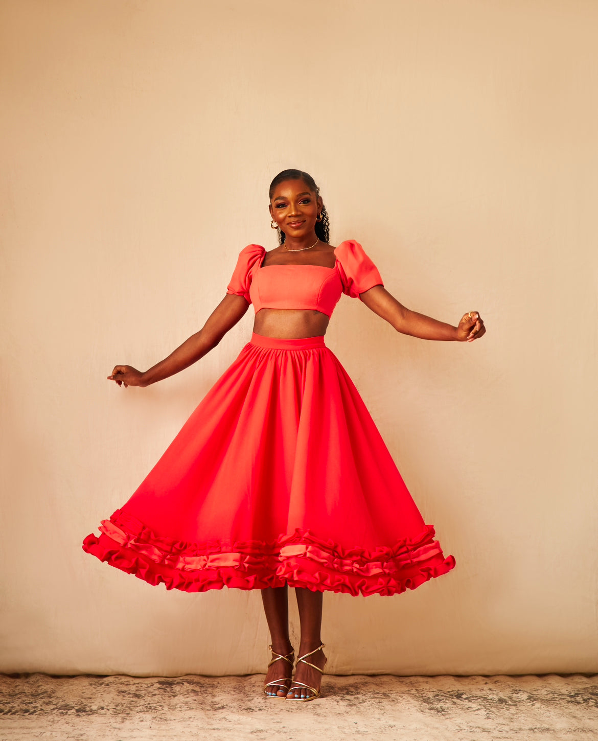 Details Include: A crop top with puff short sleeve, A flared skirt with ruffles along the bottom.