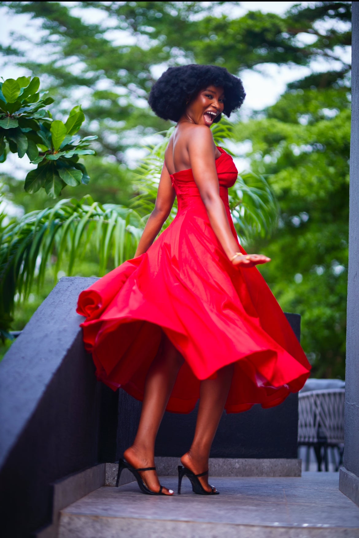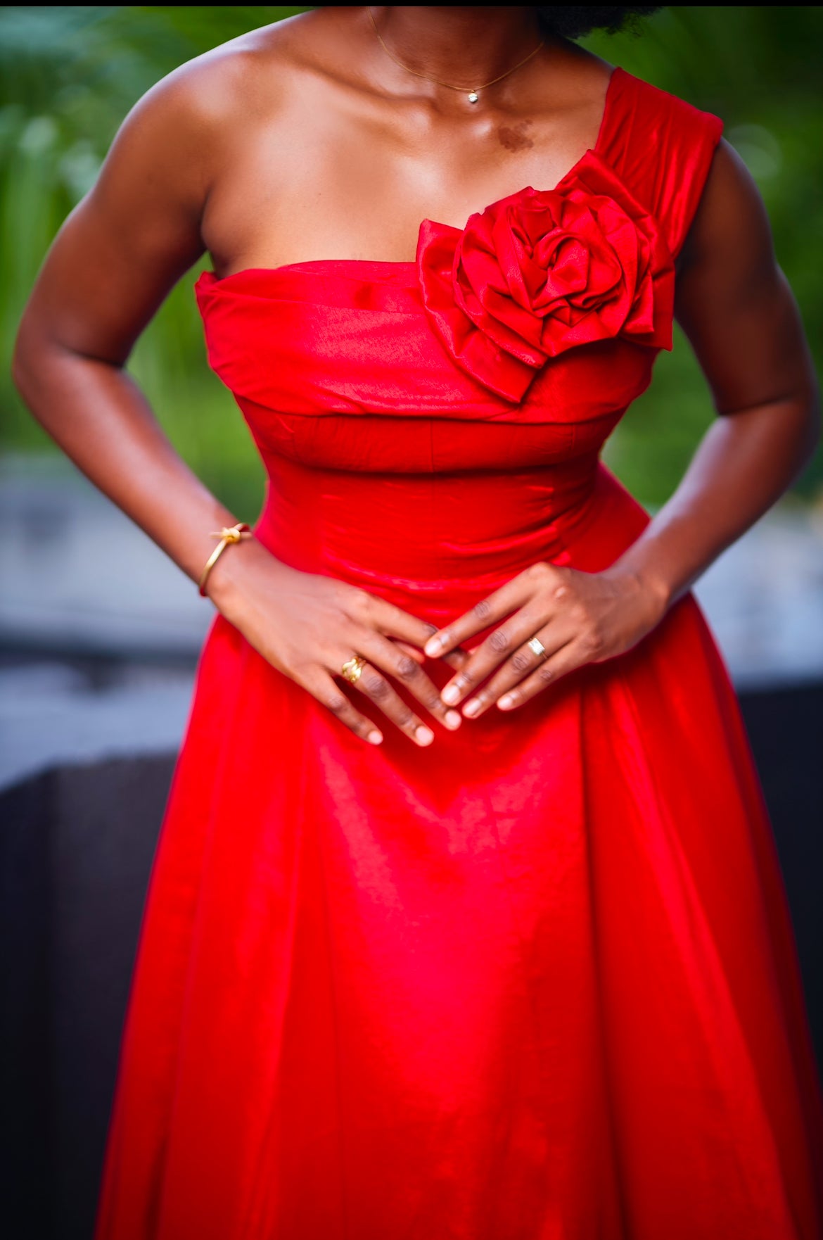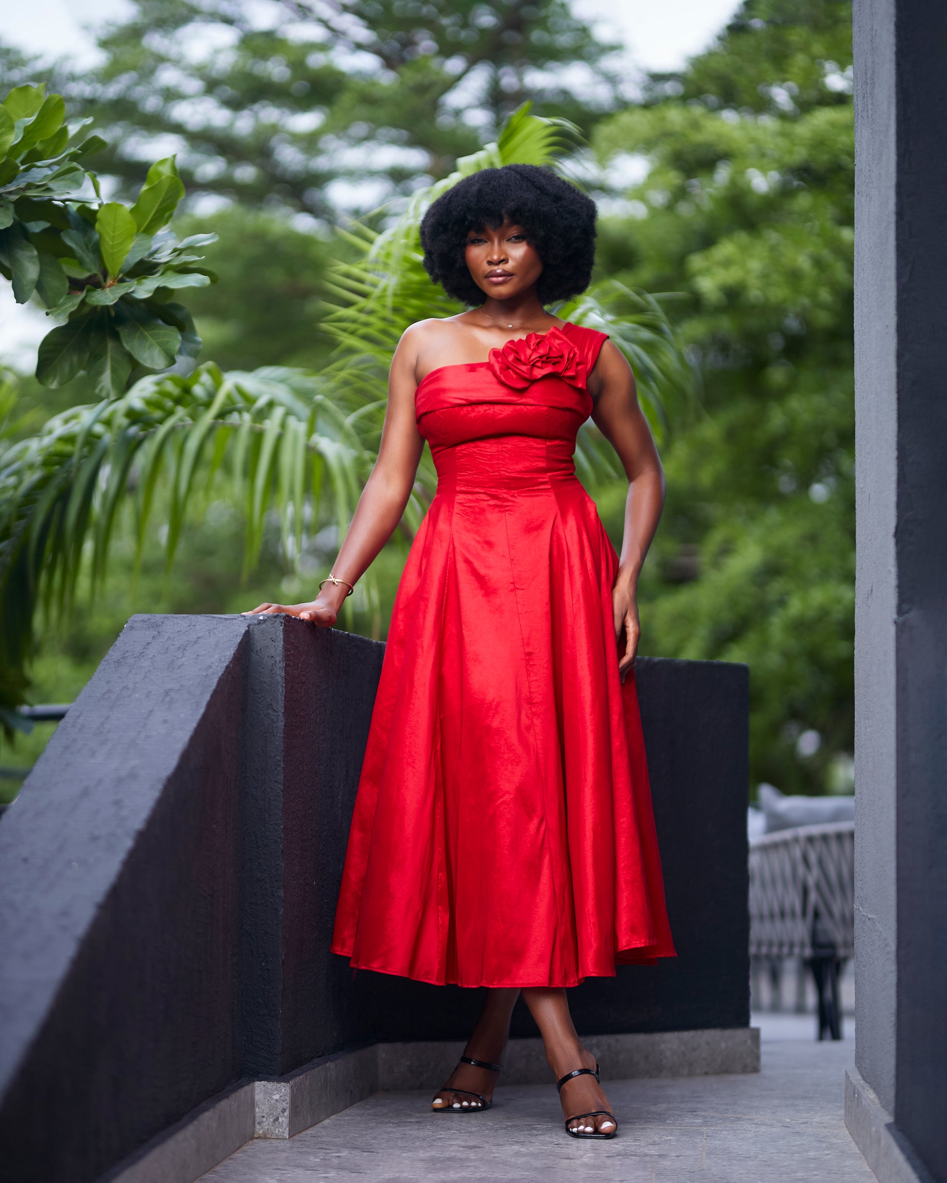 A stunning mono-strap flare dress, featuring a handcrafted floral detail along the bust line.